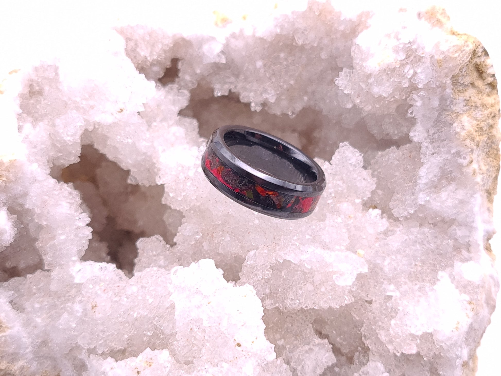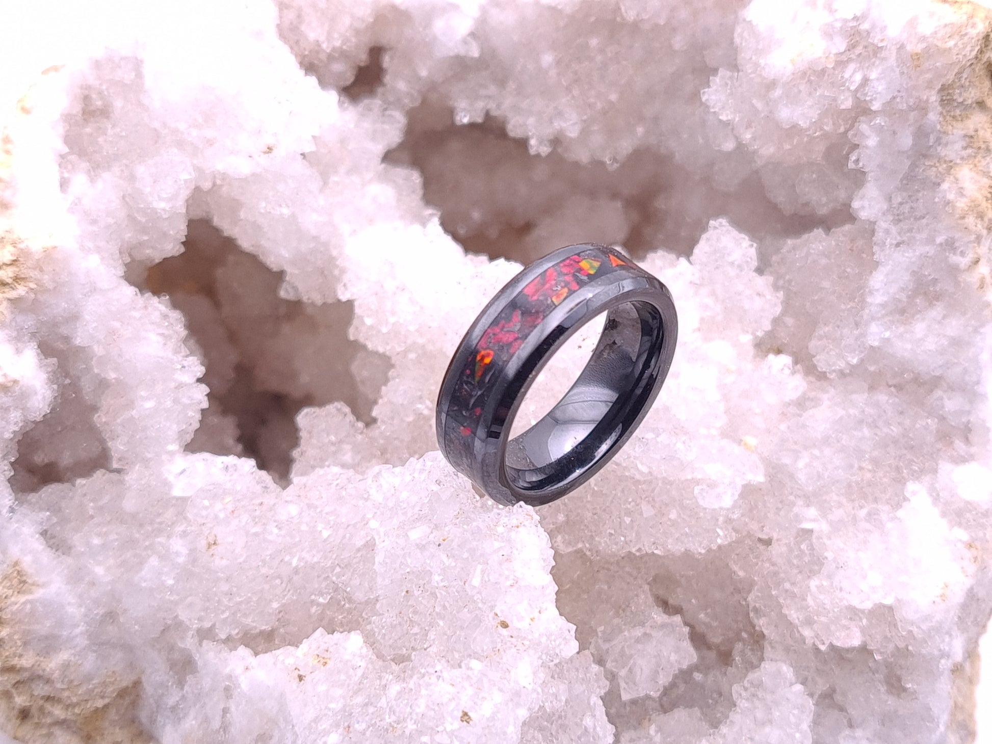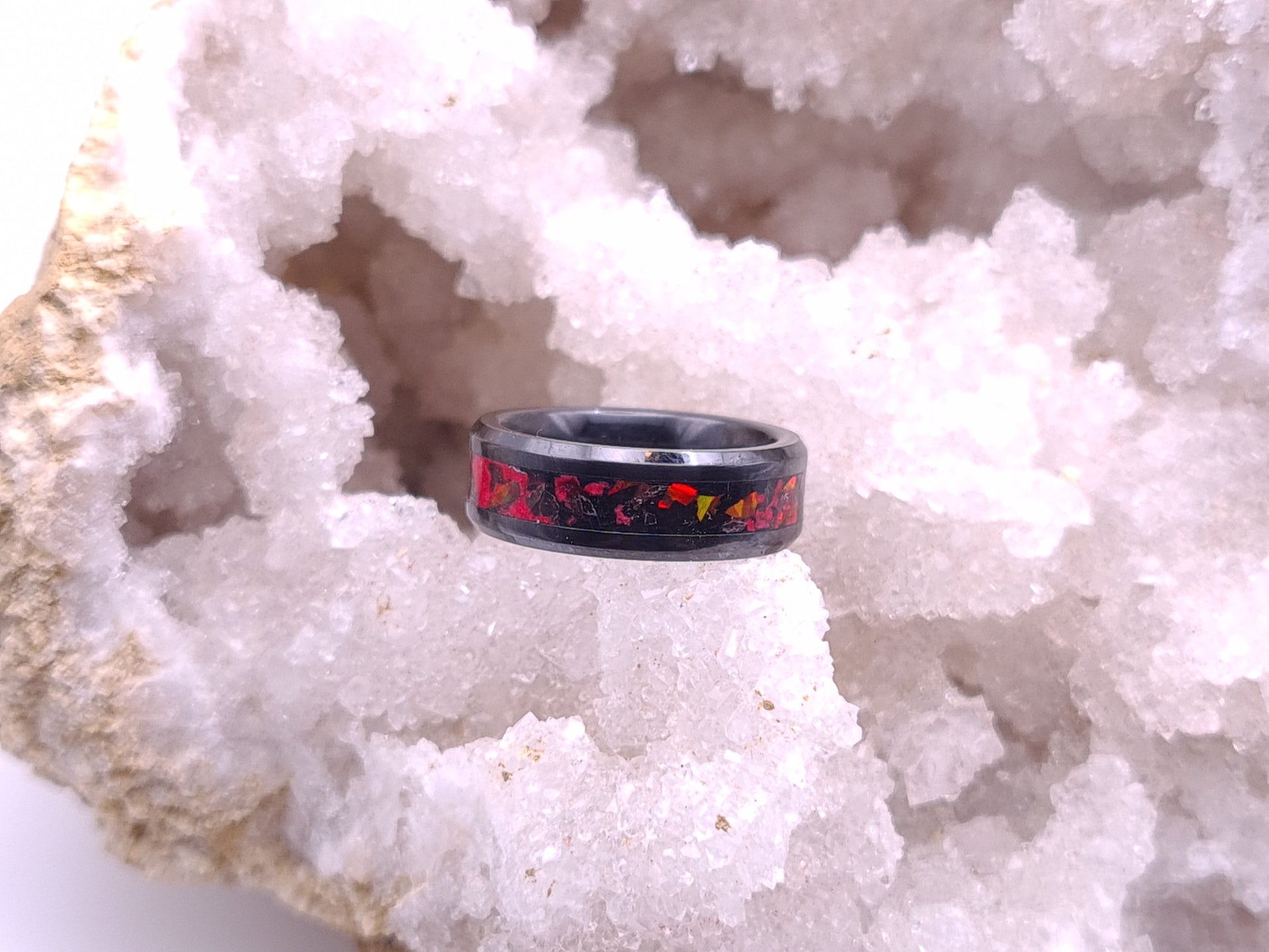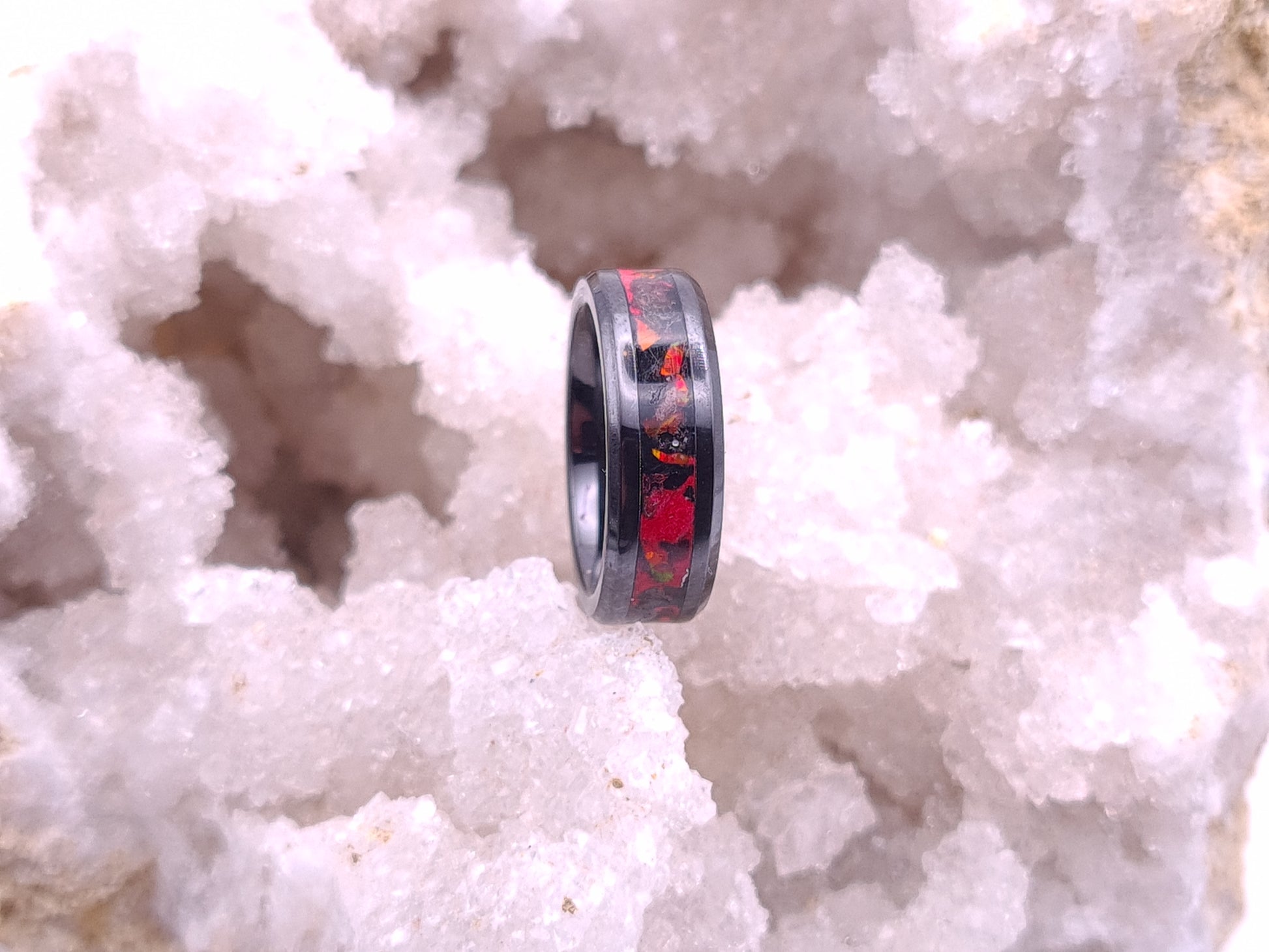 From the dark volcanic Obsidian remains, paired with a deep Crimson Opal, finished off with both Black and Cherry Red pigment, this Black Ceramic ring is a perfect little piece of uniqueness.