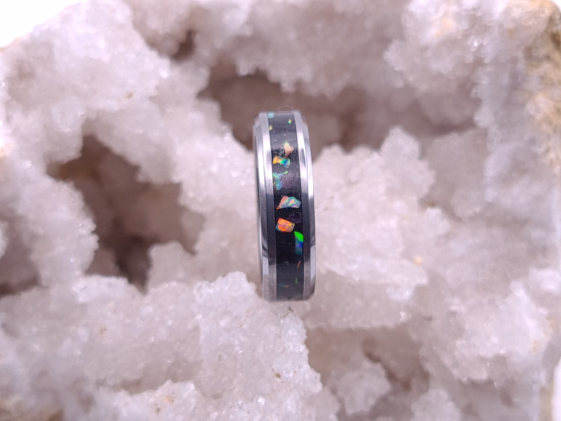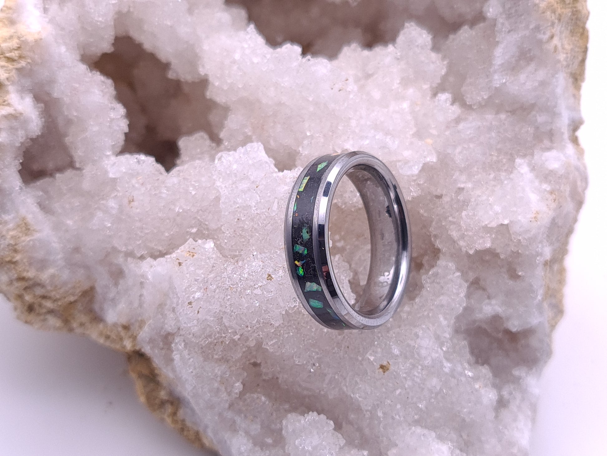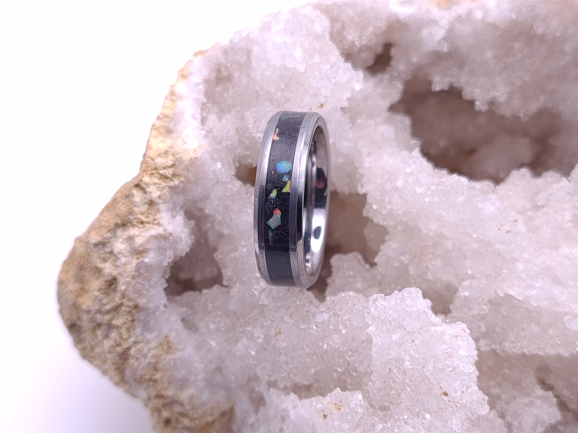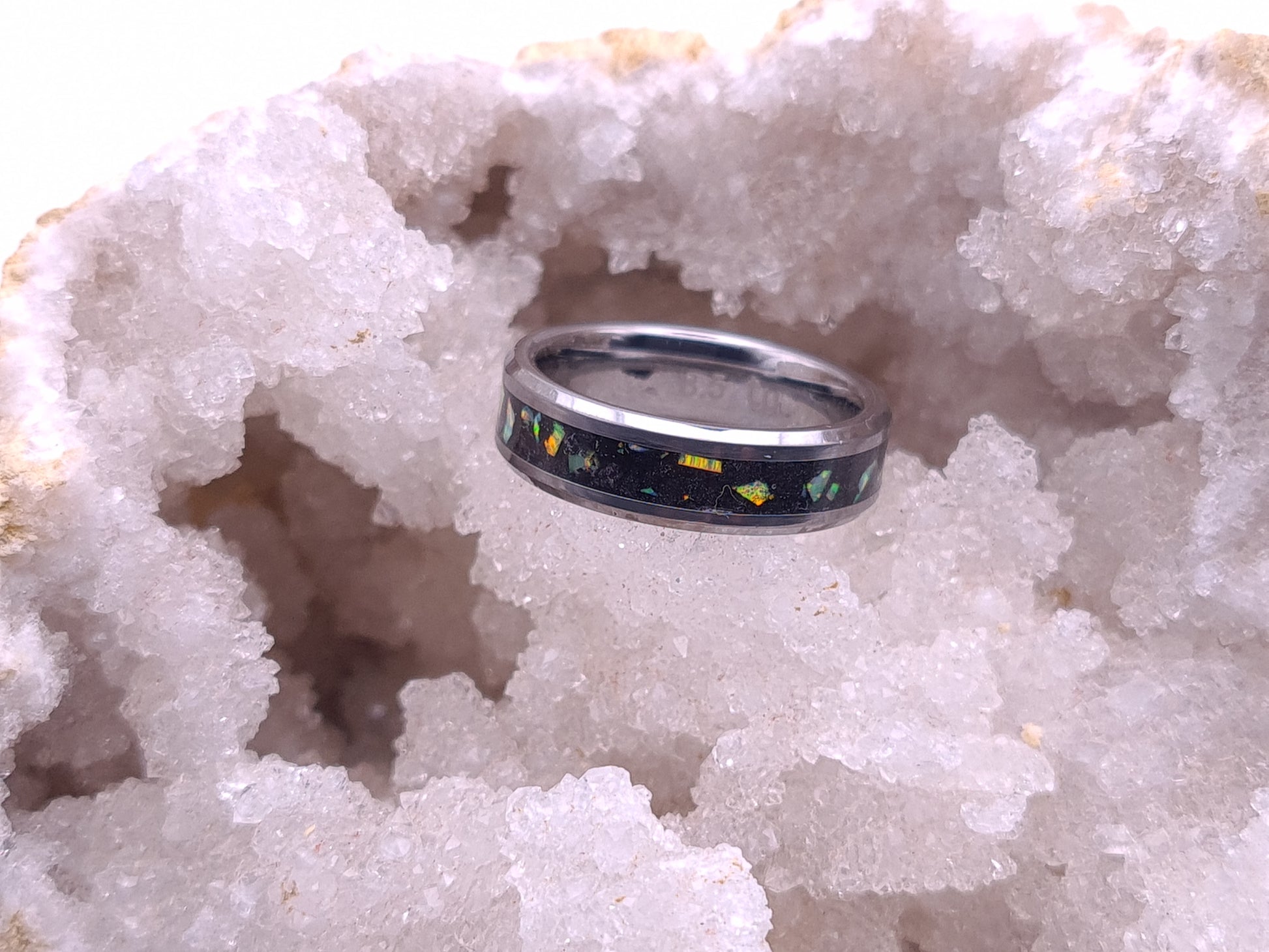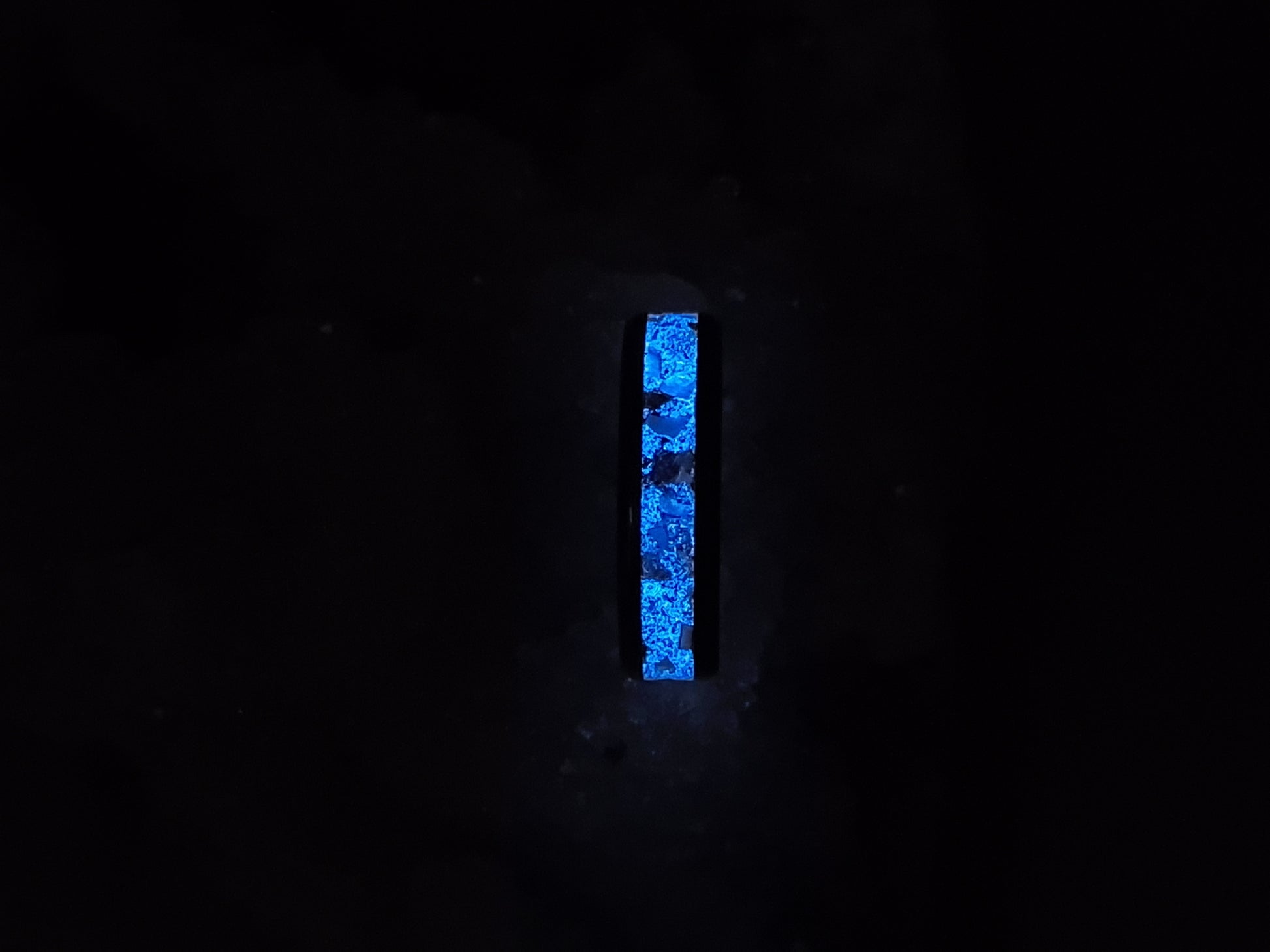A deep and dark ring, with a combination of Black pigment and Blue Starglow powder, in the dark, when charged with a UV light this ring shines a beautiful blue.